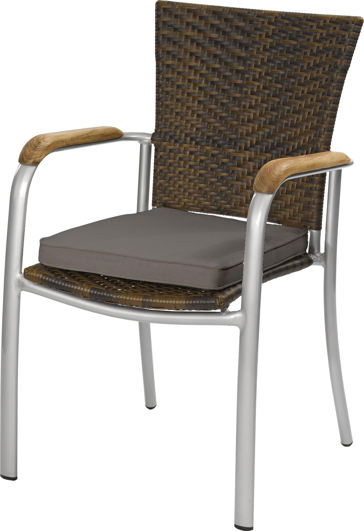 Gestell: Aluminium pulverbeschichtet in Silber Geflecht: Kunststoffgeflecht, flach gewickelt in burned (braun meliert) mit Farben von BASF Mit Teakholzarmlehnen Möglich mit Sitzkissen UV- und Wetterbeständig Gewicht4,5 kg Sitzhöhe45 cm Sitzfläche45x39 cm Gesamthöhe87 cm Armlehnenhöhe66,5 cm stapelbar10 Stück WitterungsbeständigJa UV-beständigJa